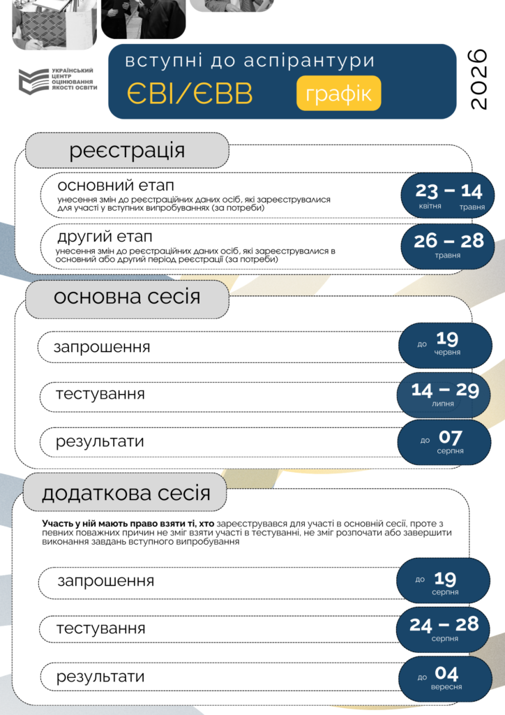- Основні сесії єдиного вступного іспиту (ЄВІ) та єдиного фахового вступного випробування (ЄФВВ) відбудуться з 26 червня до 14 липня 2026 року.